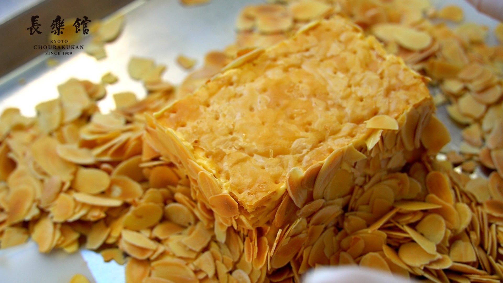 やや固めに炊き上げたカスタードがパイの軽やかさを引き立て、香ばしさとクリームの濃厚さが絶妙に調和します。サクッとナイフが入りやすく、切り分けやすい仕上がりです。側面にはローストアーモンドを飾り、香ばしさと食感のコントラストを添えました。