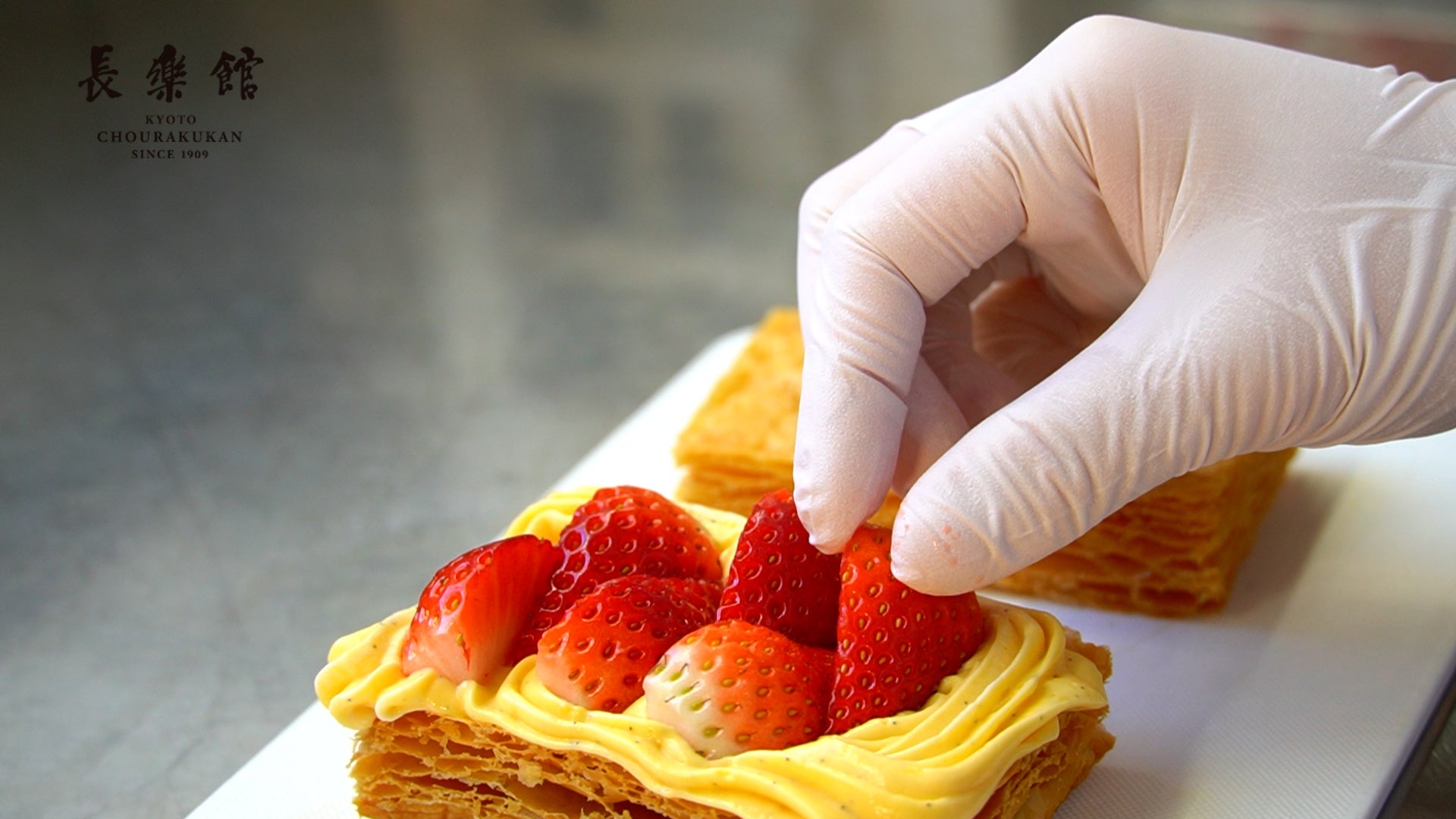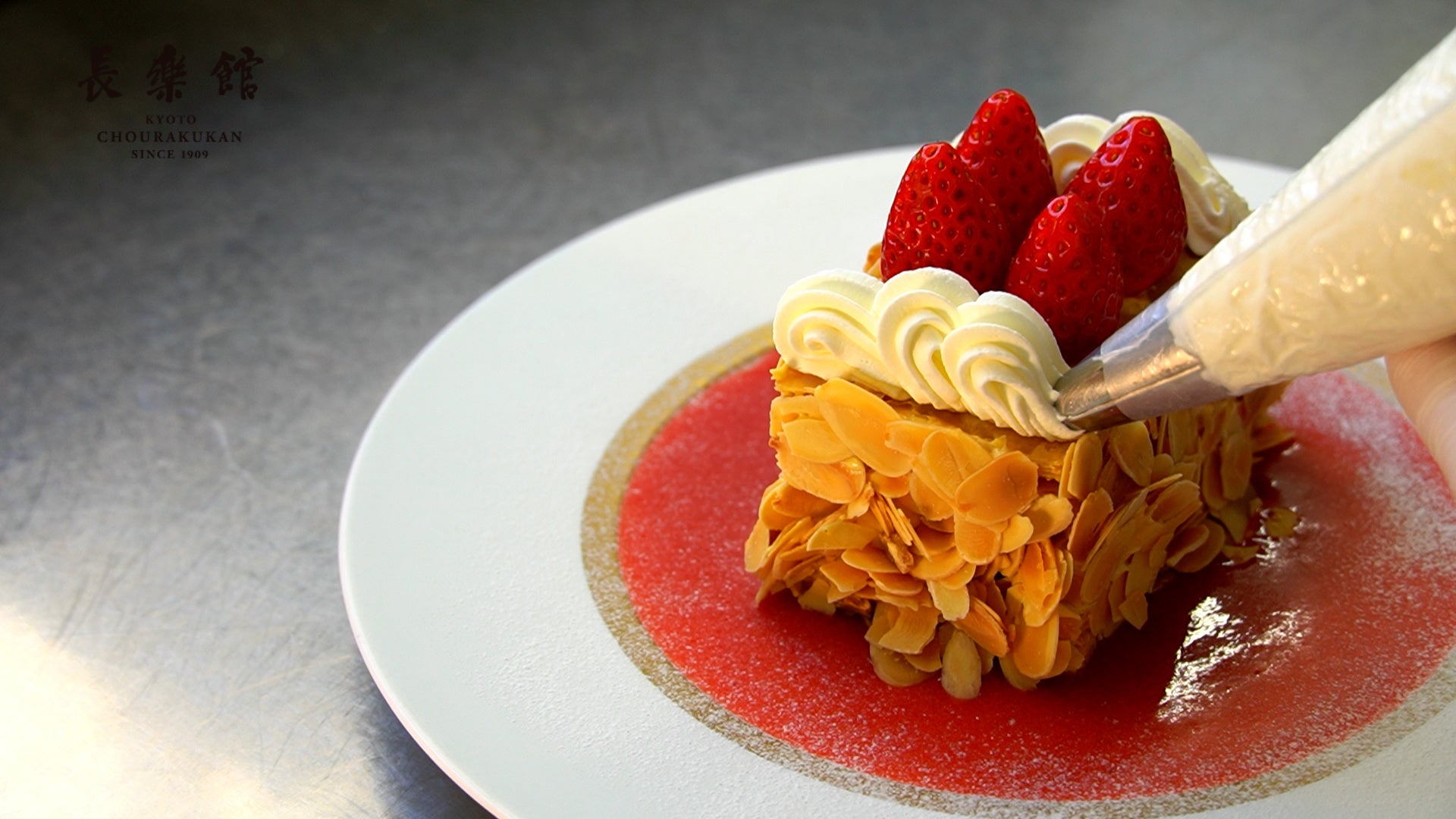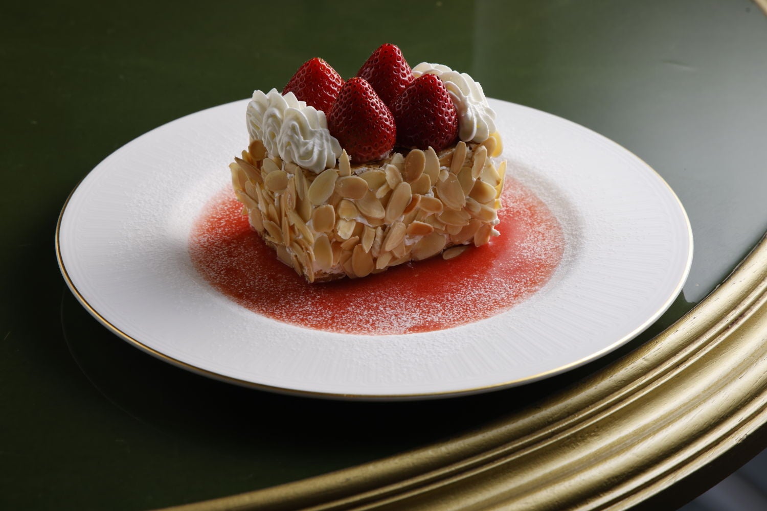 デザートカフェ長楽館の「ナポレオンパイ」は、サクッと焼き上げた自家製パイ生地に、フランス産オレンジリキュールを加えた自家製カスタードクリームと、果汁感のある厚切りのいちごを重ね、いちごジャムをアクセントに加えたミルフィーユ仕立てのスイーツです。
