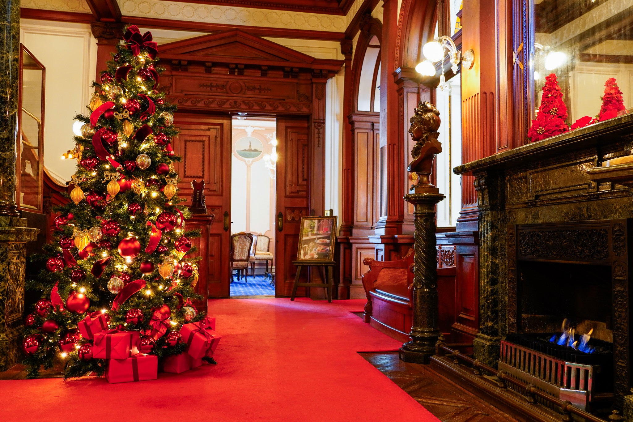 期間中は、館内外にクリスマス装飾とイルミネーションを施し、洋館全体が華やかな雰囲気に包まれます。本館1階の暖炉には炎が灯り、ロビーには赤と金を基調としたツリーを設置。夕刻には、夕刻には、エントランス前のヒマラヤ杉がライトアップされ、歴史ある建物の外観を照らします。