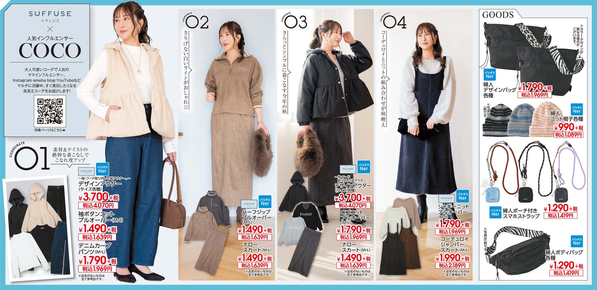 「今、着たい!」コーデ大集合。パシオスのオリジナルスタイル[SUFFUSE +PLUS(サフューズ プラス)]からは、人気インフルエンサー[COCOさん]が着る、カジュアル&フェミニンコーデをご紹介。