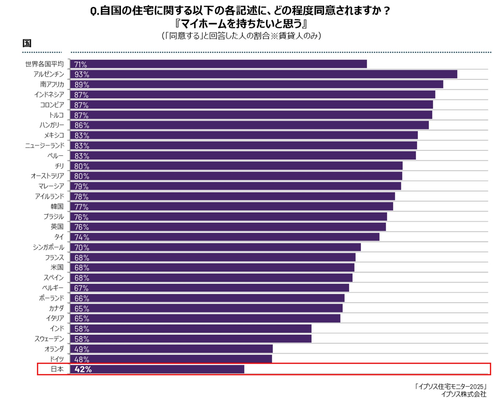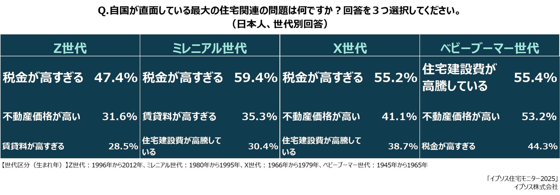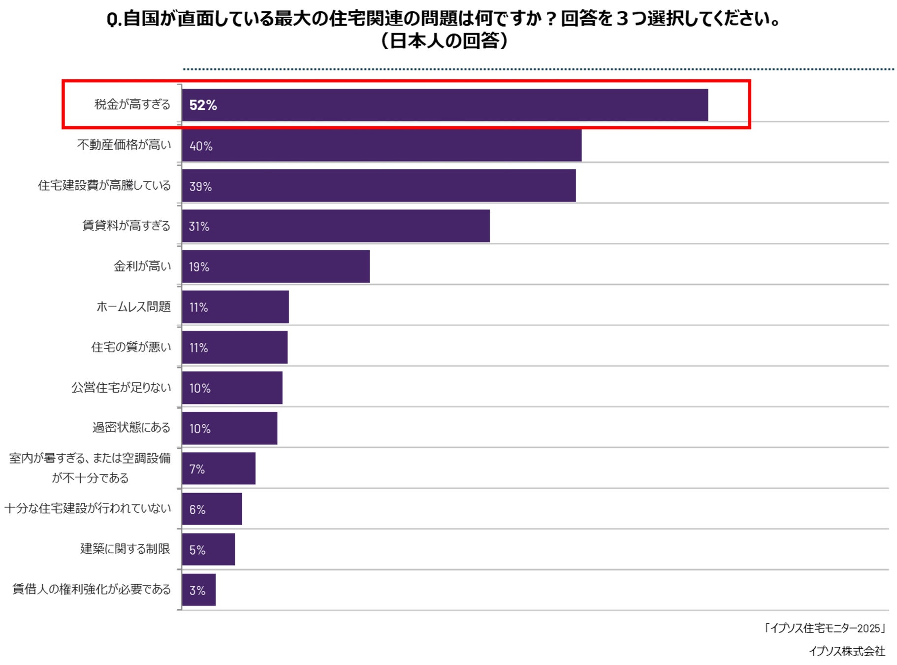 世界最大規模の世論調査会社イプソス株式会社(日本オフィス所在地:東京都港区、代表取締役:内田俊一)は、日本を含む世界30か国22,279人を対象に住宅に関する意識や希望調査を実施した「イプソス住宅モニター2025」を発表しました。調査の結果、日本は住宅関連の課題として「税金が高すぎる」を挙げる人が最も多い国であることが明らかになりました。