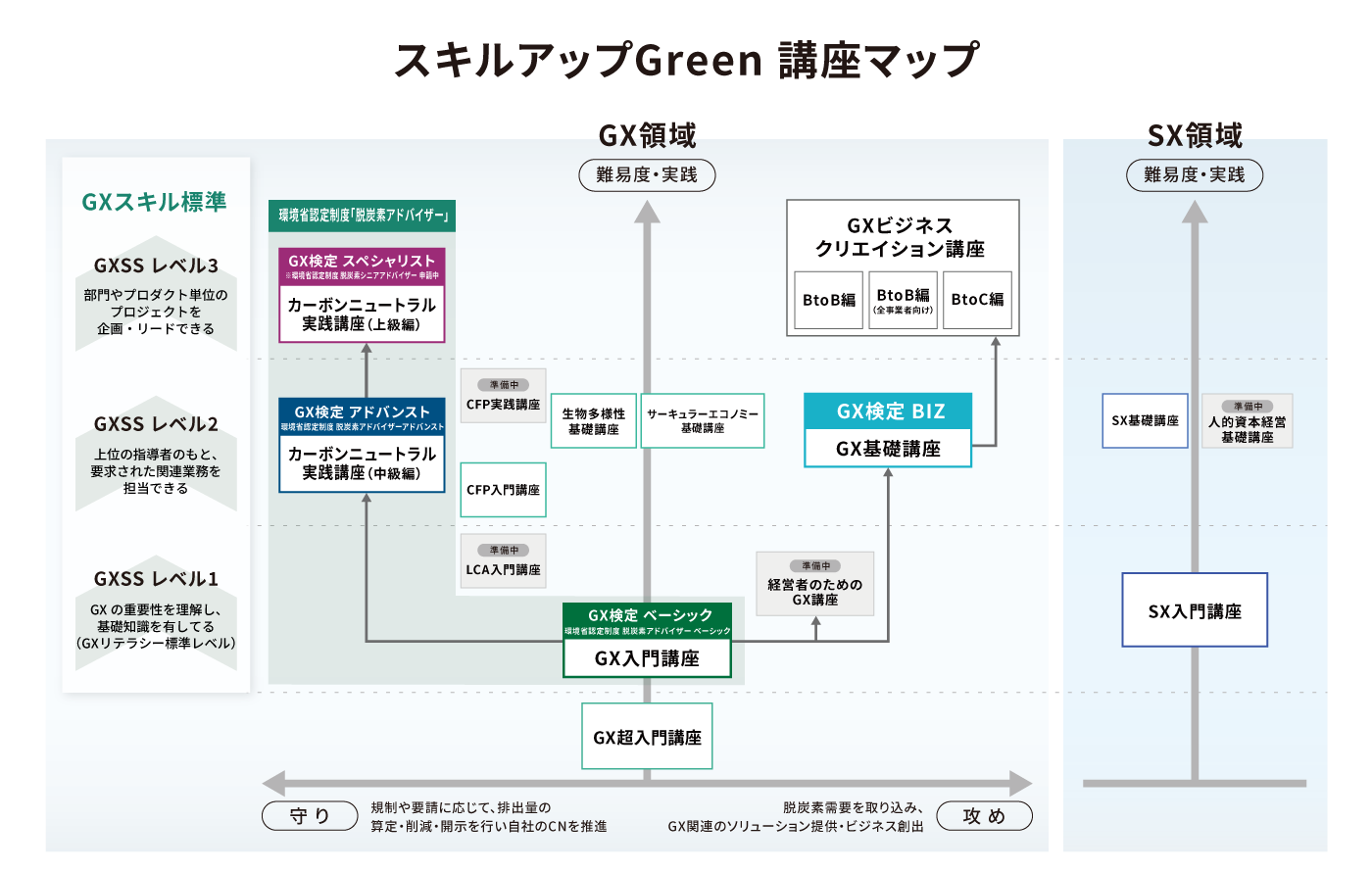 スキルアップNeXtは、「スキルアップGreen」でGXを体系的に学べる講座や、基礎知識を測る「GX検定」で企業のGX推進をワンストップでサポートしています。経産省主導のGXリーグにおいて、2024年度よりGX人材市場創造WGを立ち上げ、リーダー企業として、GX人材の役割や必要なスキルを定義した「GXスキル標準」を策定しました。