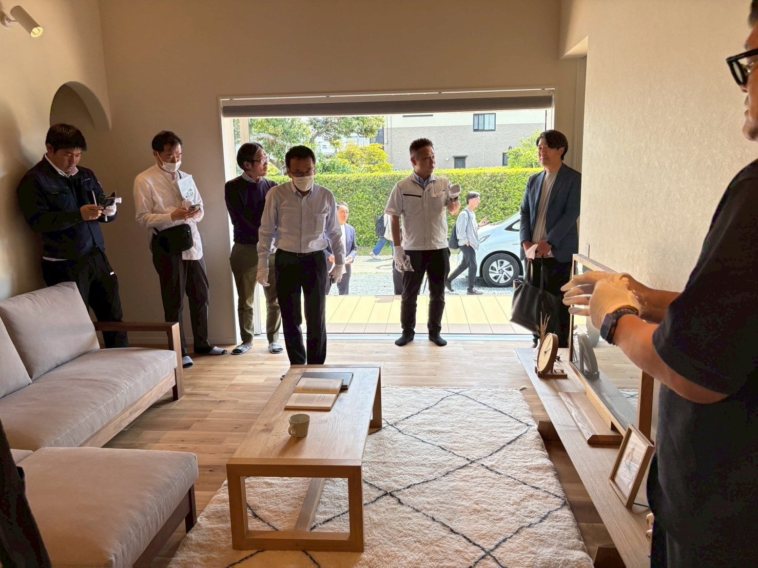 無人モデルハウスでは、無人見学の仕組みの運営会社の担当者が仕組みや集客面の効果を解説。実際の快適性モデルハウスの機能などを体感しつつ、参加者がそれぞれ気になるポイントを実際に確認しました。視察会には平松社長と竹下副社長が同行。移動中も、資産価値を保つことに照準を当てた家づくりの考え方など、より具体的な話に及びました。