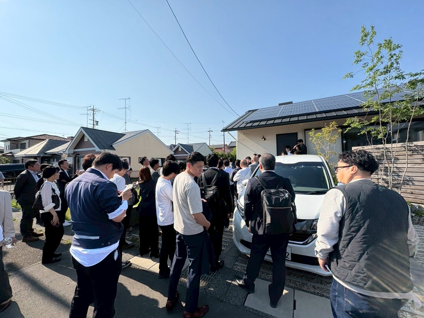 視察会当日は、近年シェアを伸ばしている規格型注文住宅の完成物件や施工現場、宿泊体験もできる無人モデルハウスを視察。現場スタッフの案内のもと、独自のWB工法を採用することで実現する快適な空気環境と、住宅性能・設備がもたらす省エネルギー性能に伴う入居後の経済効率について、平松社長が自ら見どころなどを紹介。