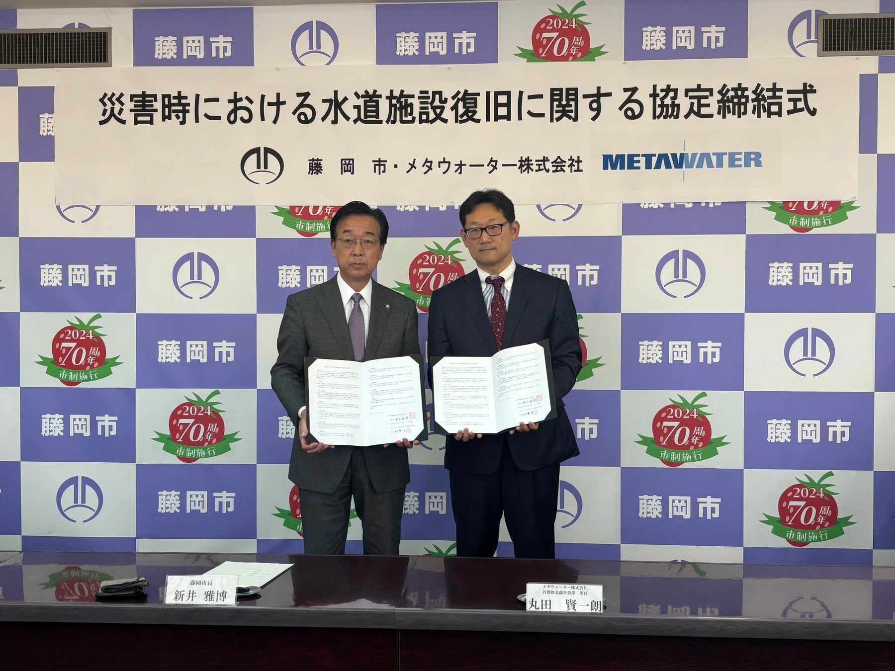 メタウォーター株式会社(社長:山口 賢二、本社:東京都千代田区)は、2025年3月27日、群馬県藤岡市(市長:新井 雅博)と「災害時における水道施設復旧に関する協定」(以下「本協定」)を締結しました。27日に行われた藤岡市役所での協定締結式には、新井市長、当社首都圏北部営業部部長の丸田賢一郎らが参加しました。