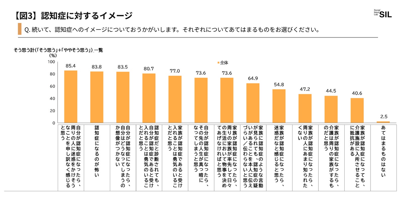 ・次に、認知症に対するイメージを尋ねると、「周囲に迷惑をかけるのが申し訳ない(85.4%)」「認知症になるのが怖い(83.8%)」「自分が認知症になったら人生が真っ暗になる(73.6%)」が7~8割で上位に並び、自責の念や絶望感などのイメージを抱く人が多いことが明らかになりました。