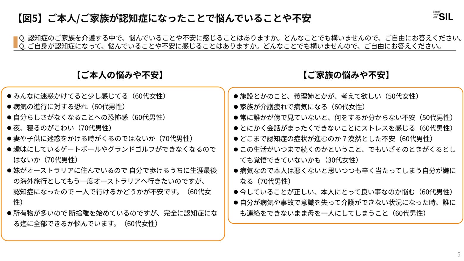 ・ご家族が認知症になったことで感じる悩みや不安は介護に関するものが多くあがり、「どこまで認知症の症状が進むのか?漠然とした不安」「今していることが正しい、本人にとって良い事なのか悩む」など、認知症のご本人と向き合う中での負担や認知症の進行に関する不安、介護の方針について葛藤する声などがみられました【図5】。