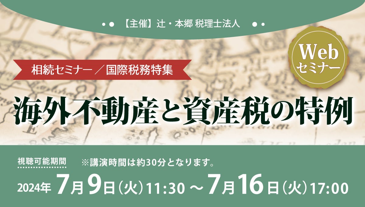 辻・本郷 税理士法人(本社:東京都新宿区、理事長:徳田孝司)は、2024年7月9日(火)より「【相続セミナー】国際税務特集 海外不動産と資産税の特例 」を開催いたします。近年、日本国外の不動産を所有する方が増えています。本セミナーでは、海外不動産にまつわる、相続税・所得税の特例をご説明します。相続税の特例から小規模宅地等の特例、相続時精算課税を、所得税の特例からは居住用財産の3,000万円控除について解説します。