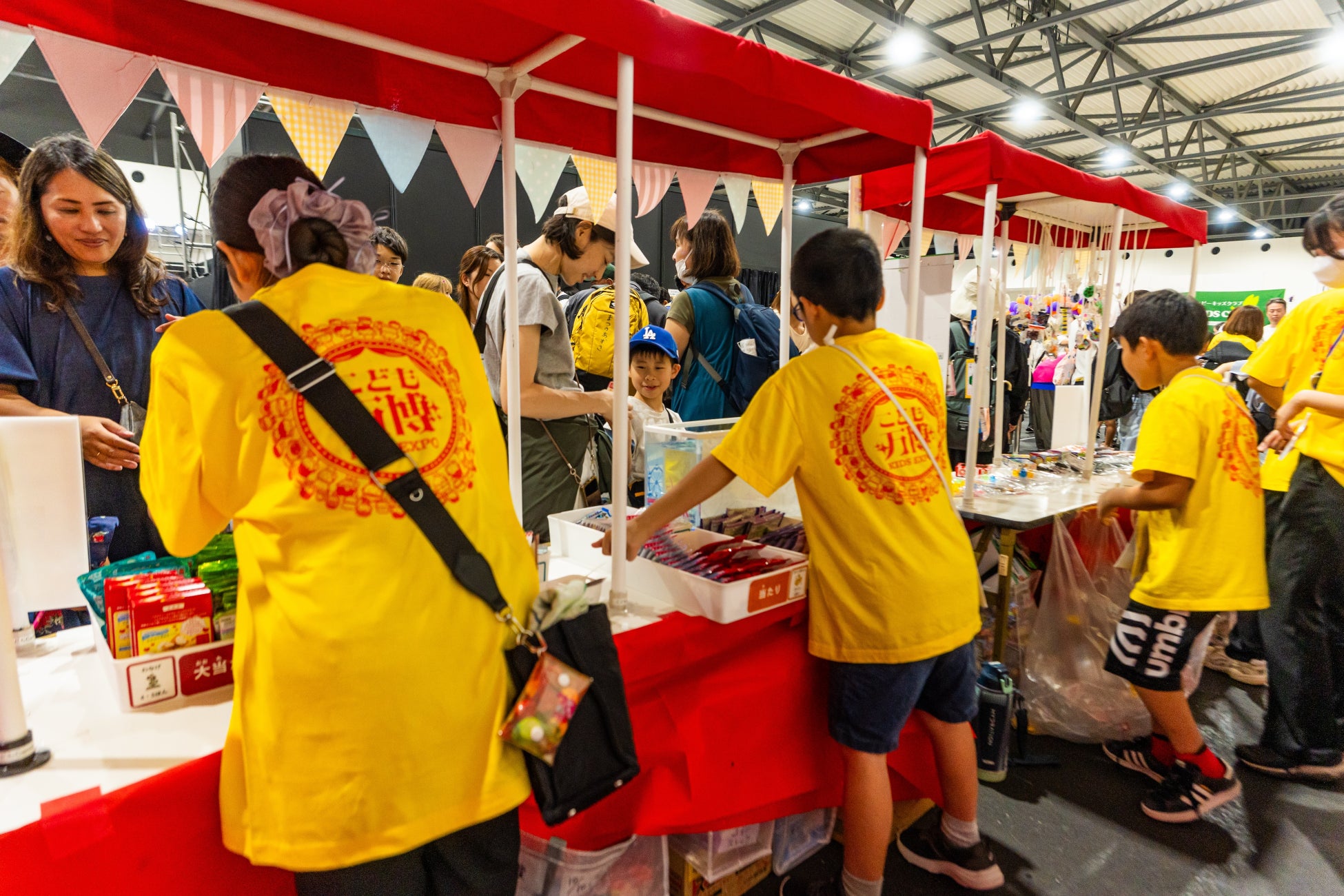 子どもたちが縁日の店長となって接客やサービス提供を行う、こども万博の象徴的なコンテンツです。射的、ヨーヨー釣り、千本くじなどの縁日を子どもたち自身が運営します。大人が用意した体験をするのではなく、子ども自身が主体的に行動し、困りごとを周りと協力して解決する力を養います。ストライプ柄の屋台やサーカスをイメージした装飾で、会場を明るい雰囲気に彩ります。