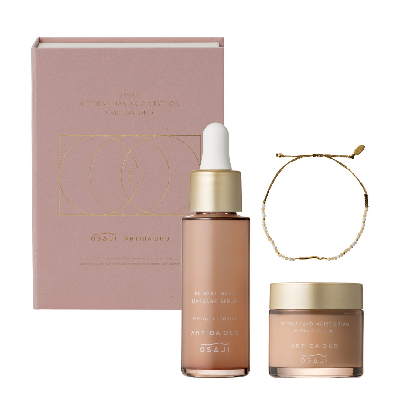 特別デザイン・調香のハンドケアアイテム「リトリート ハンド シリーズ」とこのセットでしか手に入らないOSAJIのロゴをモチーフにしたチャームをあしらったブレスレットを組み合わせた、スペシャルなセットをご用意しました。ギフトを開く瞬間の期待感を静かに高めてくれる、ブック型パッケージを採用しています。
