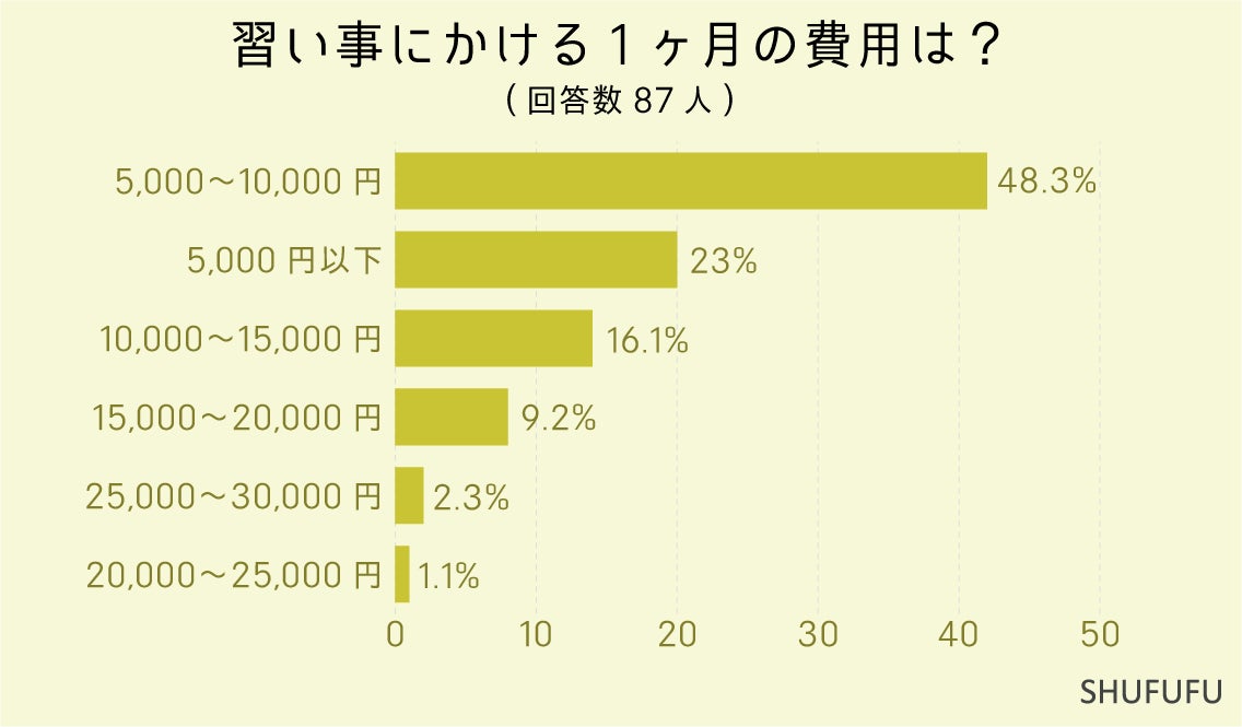 習い事にかける1ヶ月の費用に関しては、「5,000~10,000円」が1位でした。1つの習い事の月謝が大体このくらいの場合が多いのかもしれません。