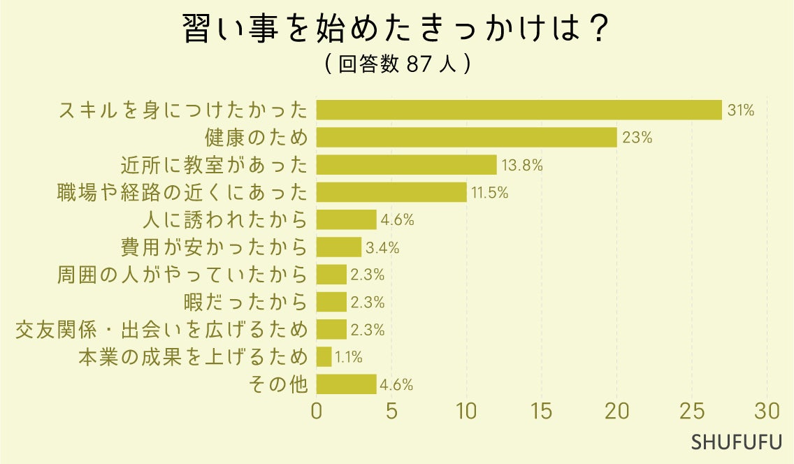 習い事を始めたきっかけを尋ねたところ、1位は「スキルを身につけたかった(31%)」、2位「健康のため(23%)」となりました。「英語・外国語」「パソコン関連」などの習い事をすると具体的なスキルアップになりますね。