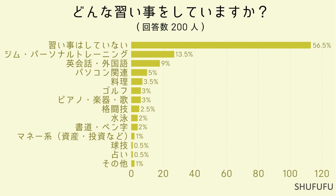 どんな習い事をしていますか?(複数選択可)の問いに対して最も多かったのが「習い事はしていない(56.5%)」でした。 次いで「ジム・パーソナルトレーニング(13.5%)」「英会話・外国語(9%)」という結果でした。半数以上の方が習い事をしていない結果になりました。