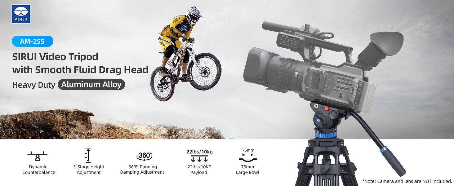 SIRUI ビデオ三脚 最大190cm高さ プロフェッショナルヘビーデューティ三脚 フルードヘッド 流体雲台 最大荷重10kg 360°パン&+90°/-75°チルト デジタル一眼レフ・カムコーダー・カメラ用クイックリリースプレート付き AM-25S