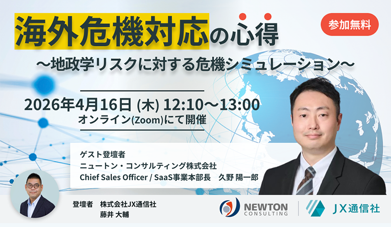 リスクマネジメントコンサルティングを手掛けるニュートン・コンサルティング株式会社(本社:東京都千代田区、代表取締役社長:副島一也)は、株式会社JX通信社と共催で4月16日(木)12:10~13:00に無料ウェビナー「海外危機対応の心得~地政学リスクに対する危機シミュレーション~」を開催いたします。
