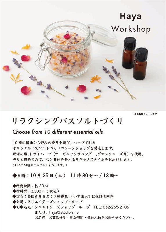 出店期間中の10月25日(土)には、Hayaの精油を選びハーブを混ぜてオリジナルバスソルトをつくるワークショップを開催。代表の中村が精油のご説明をしながらお手伝いします。この機会に是非ご参加ください。*イベントは終了しました