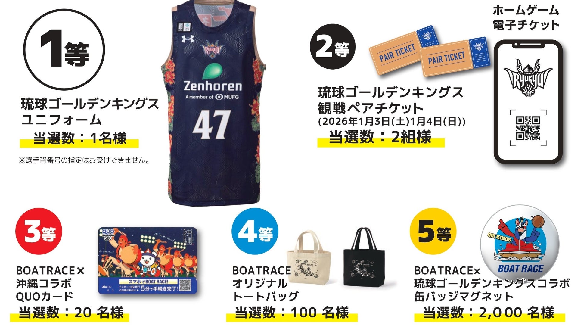 当日はBOAT RACE PRブースを設置し、ユニフォームやペアチケット等が当たるハズレ無しのジャンボガチャ抽選会等、ご来場の皆様にお楽しみいただける企画を実施いたします。また、オリジナルコラボグッズの先着配布や、琉球ゴールデンキングス仕様にラッピングされたボートの展示等、ボートレースの魅力も発信しながらホームゲームを盛り上げます。