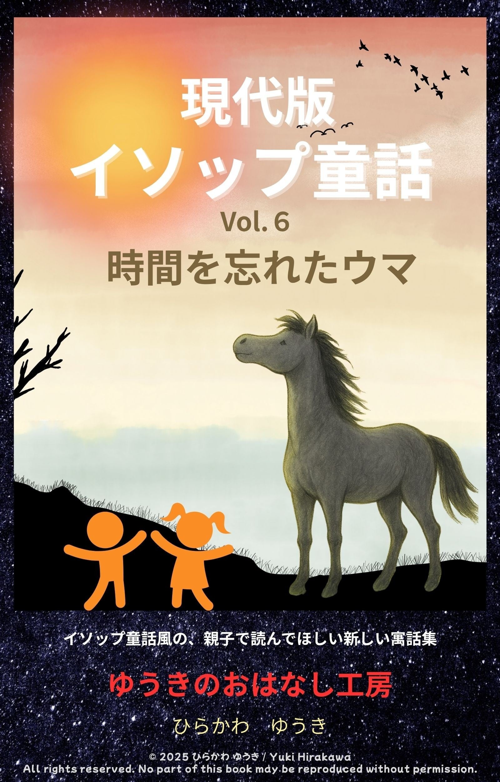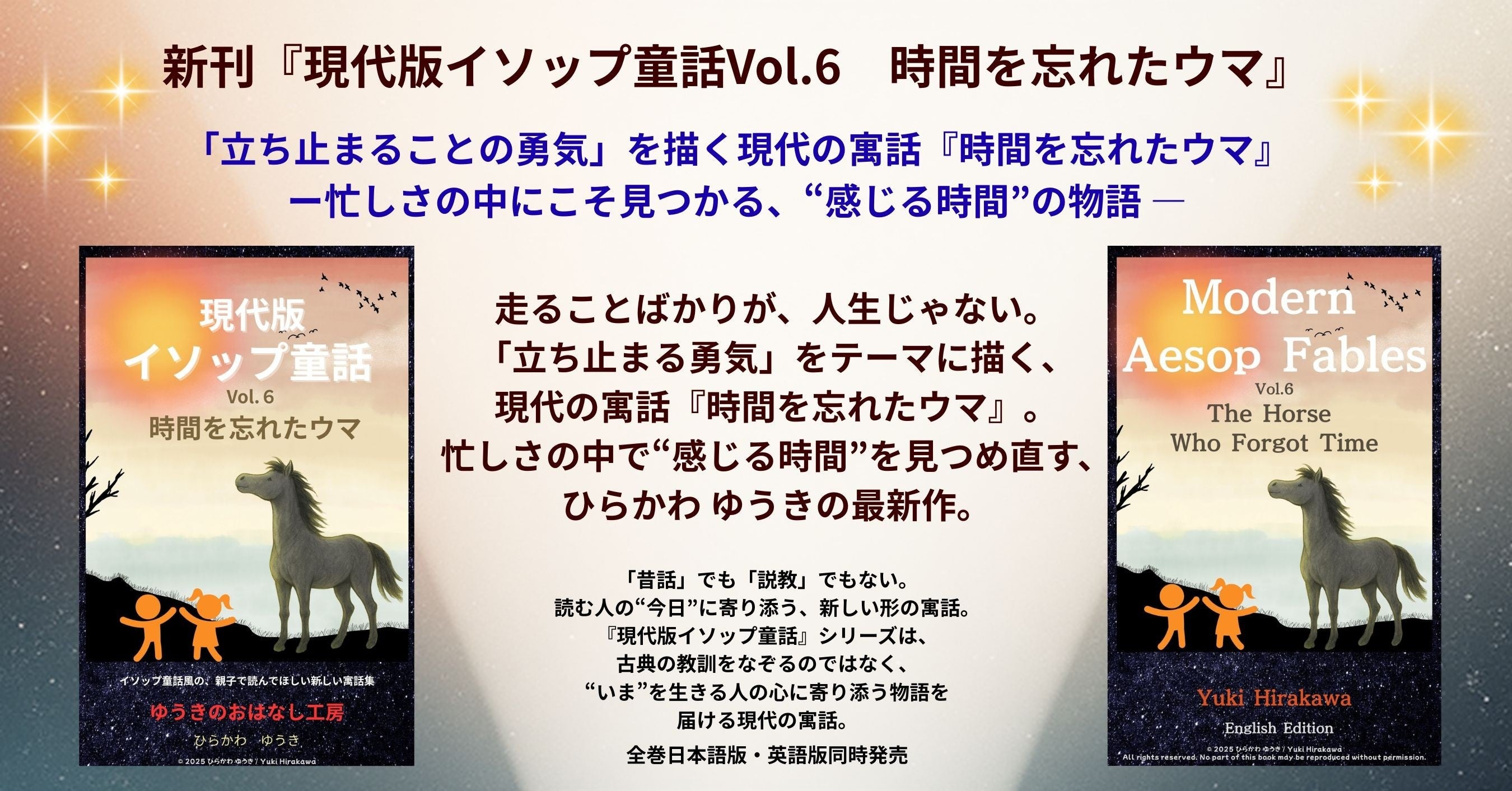保育士・幼児教育研究家として長年子どもと向き合ってきたひらかわ ゆうき(ゆうきのおはなし工房)による《現代版イソップ童話》シリーズ第6弾『時間を忘れたウマ』日本語版・英語版が刊行されました。