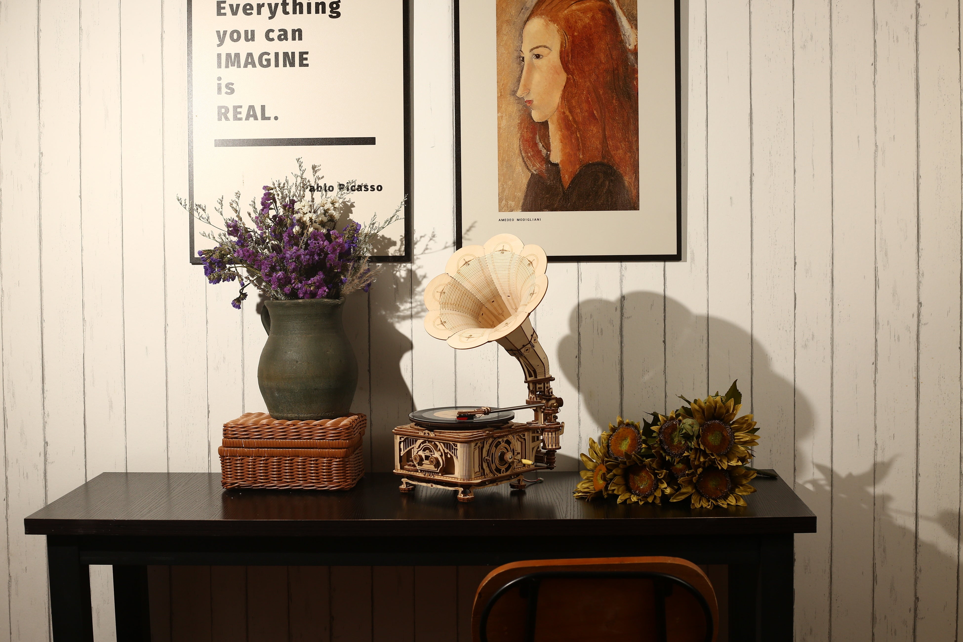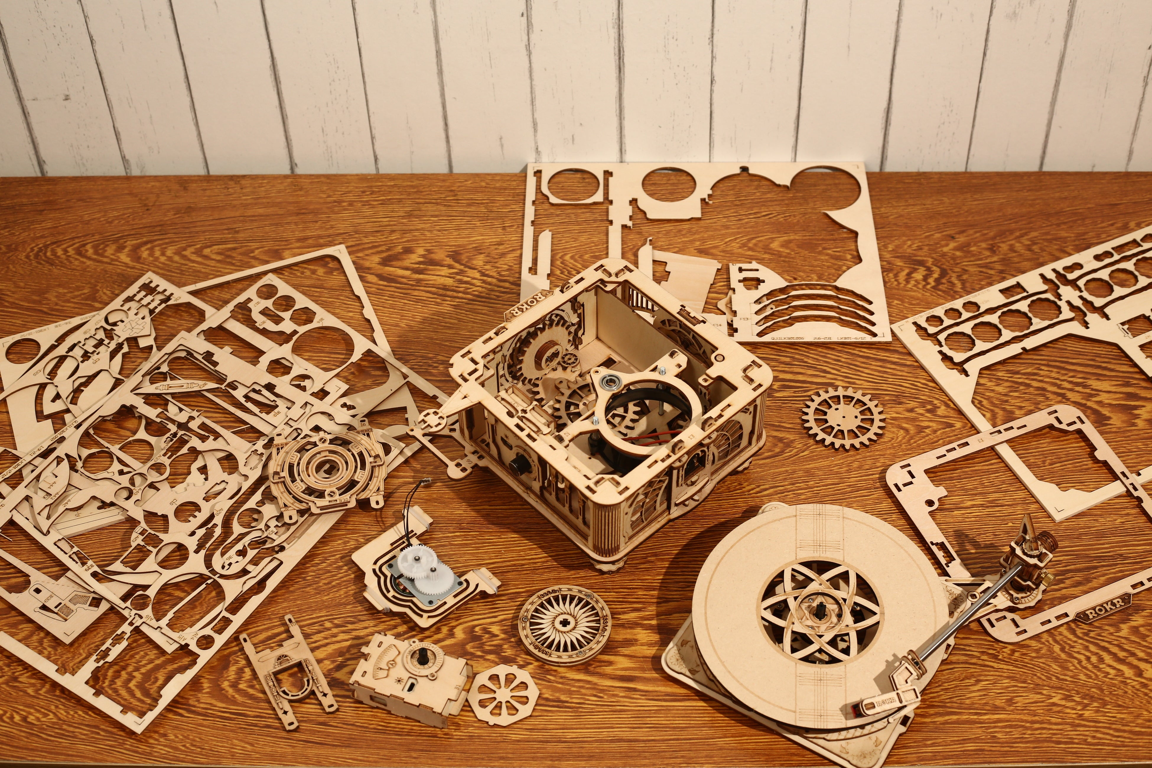 1880年代ごろに流通していた、蓄音機のデザインを思わせるようなアンティークなホーン付き。側面は複数のパーツ×焼きで、非常に細かなデザインとなっています。また、レコード盤の回転速度(回転数)や、音楽のボリューム調節ができるなど、リアルさへのこだわりが細部にまで詰まったウッドパズルです。部屋のインテリアとしても魅力的で、飾ると雰囲気ある空間になります。