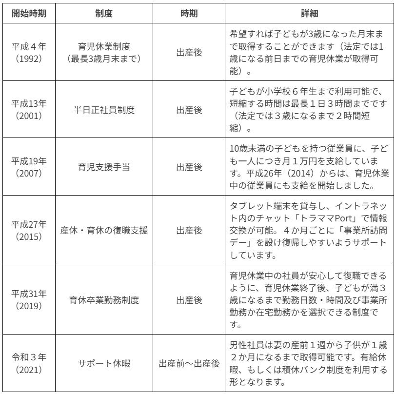 また、当社の育児休業制度は、子供が1歳になるまでの法定育児休業期間終了後も、子供が満3歳到達後の月末まで休業することができる制度となっており、他にも妻の産前1週間から子どもが1歳2ヶ月になるまでの期間に取得できる「サポート休暇」など、男女ともに活用できる様々な独自の制度を設けています。今後も長く働きやすい企業づくりを進めてまいります。