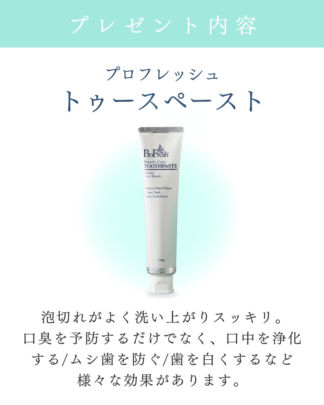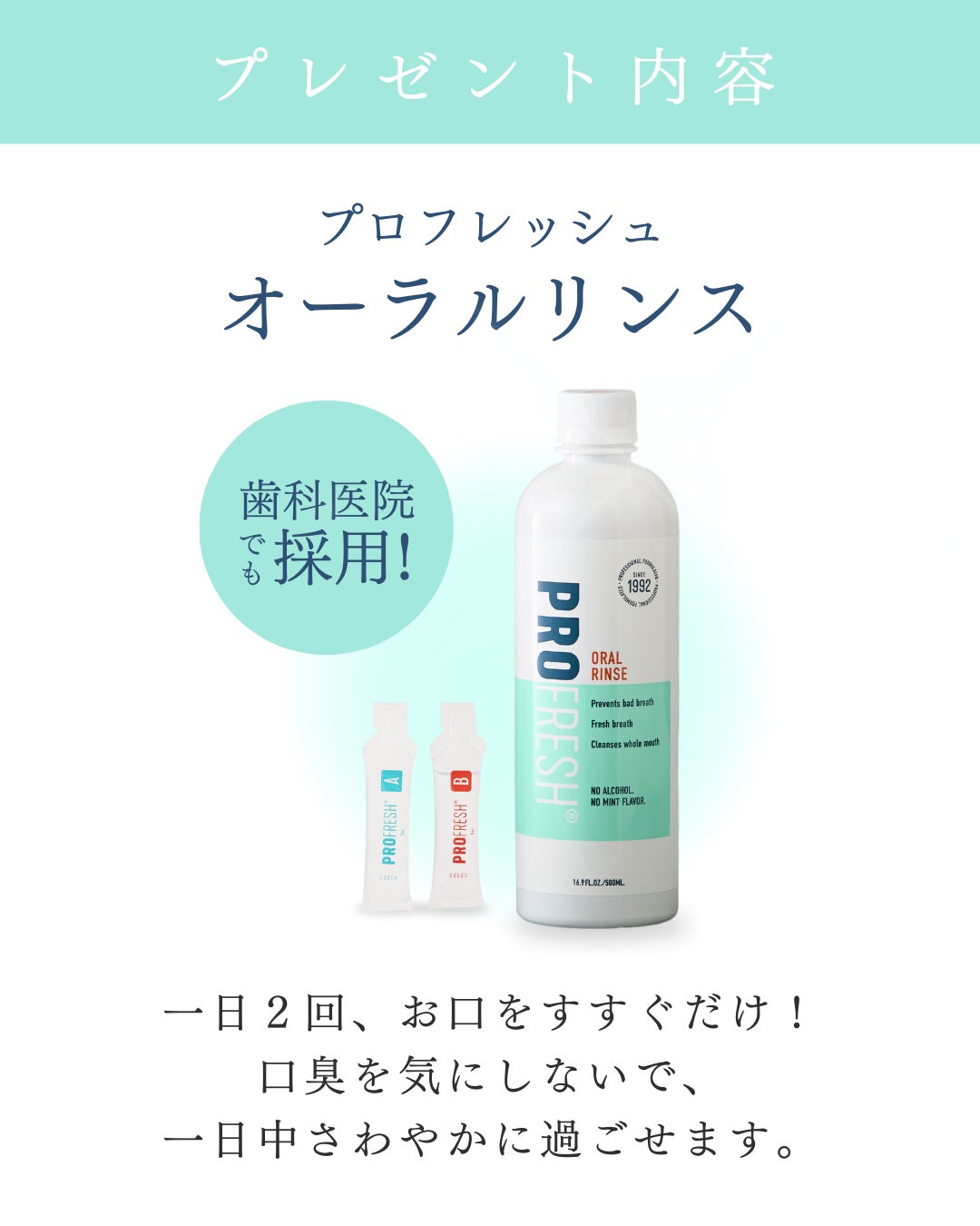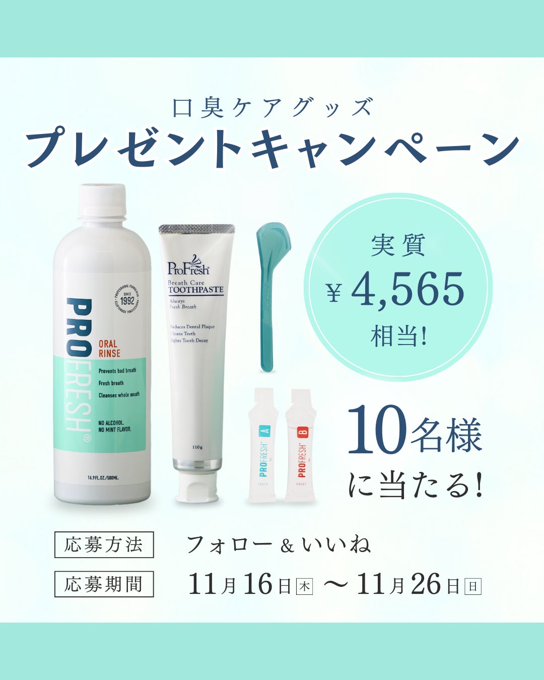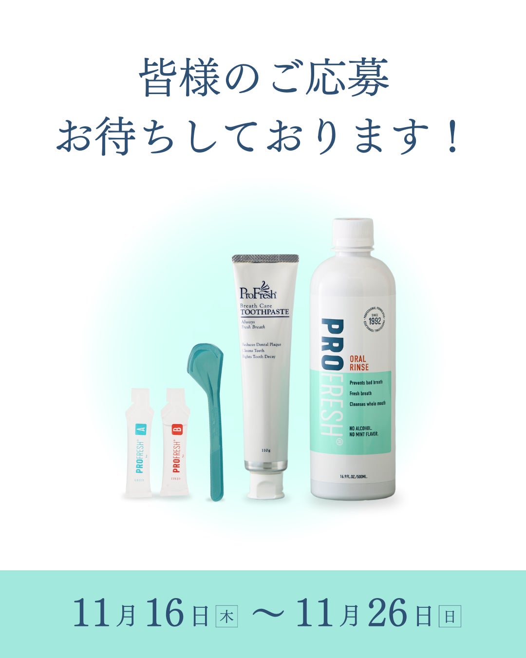 口臭ケアのコンプリートセット(プロフレッシュオーラルリンス、トゥースペースト、タングスクレーパー)を合計10名様にプレゼント。2023年11月16日(木)~2023年11月26日(日)まで