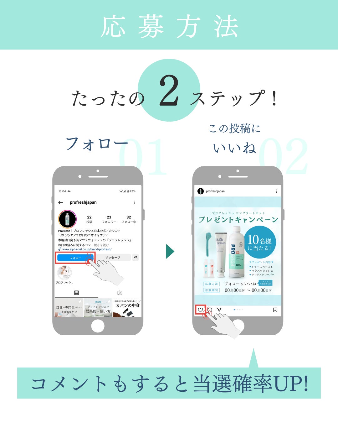 応募期間中にプロフレッシュジャパン公式インスタグラム上でフォロー&いいねしていただいた方の中から抽選で10名様に、口臭ケアセット「プロフレッシュ コンプリートセット」をプレゼントいたします。