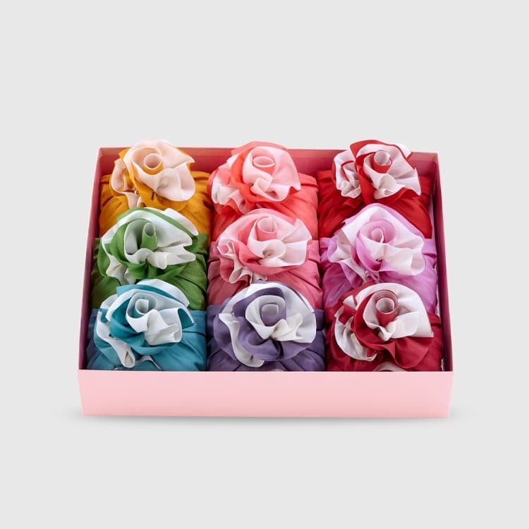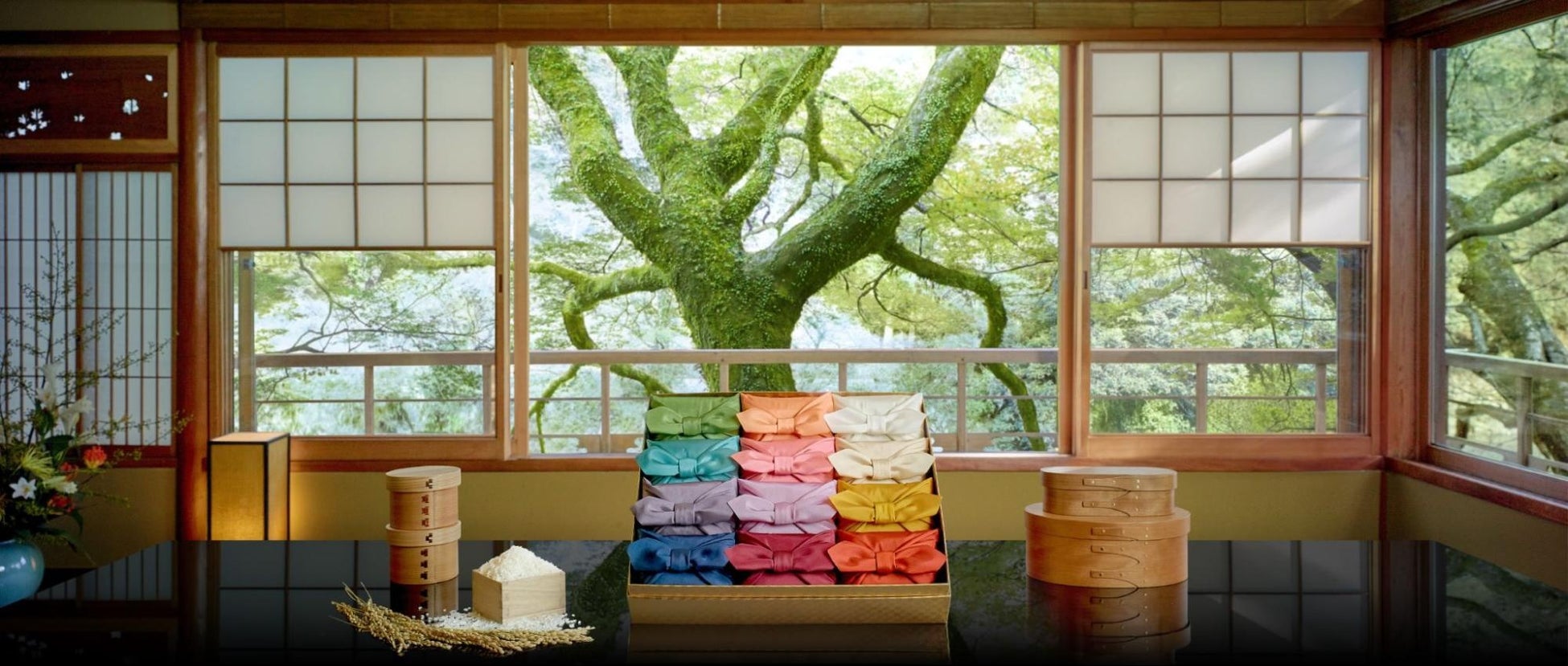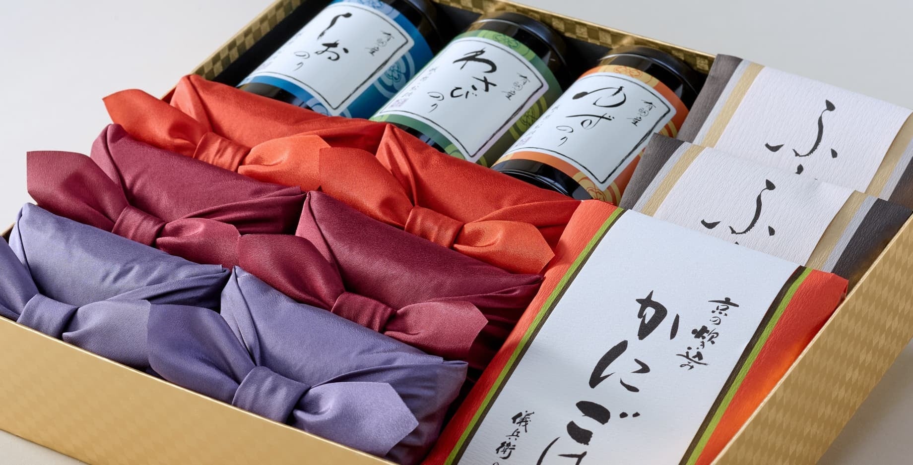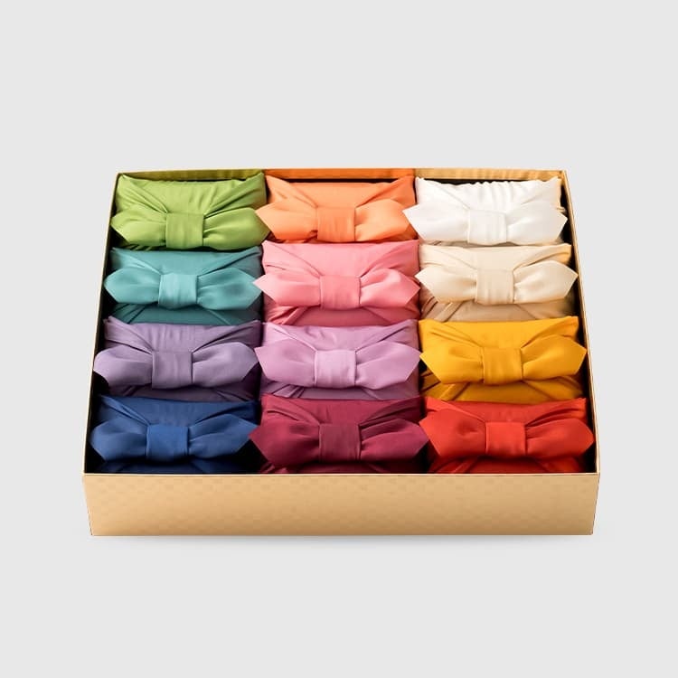 箱を開けると思わず見惚れる和のグラデーションが特徴の代表作「十二単シリーズ」。色とりどりの風呂敷に一つひとつ丁寧に包まれた姿は、その華やかさが人を引きつけます。感謝の気持ちを伝統の彩りに込めて贈ることができます。