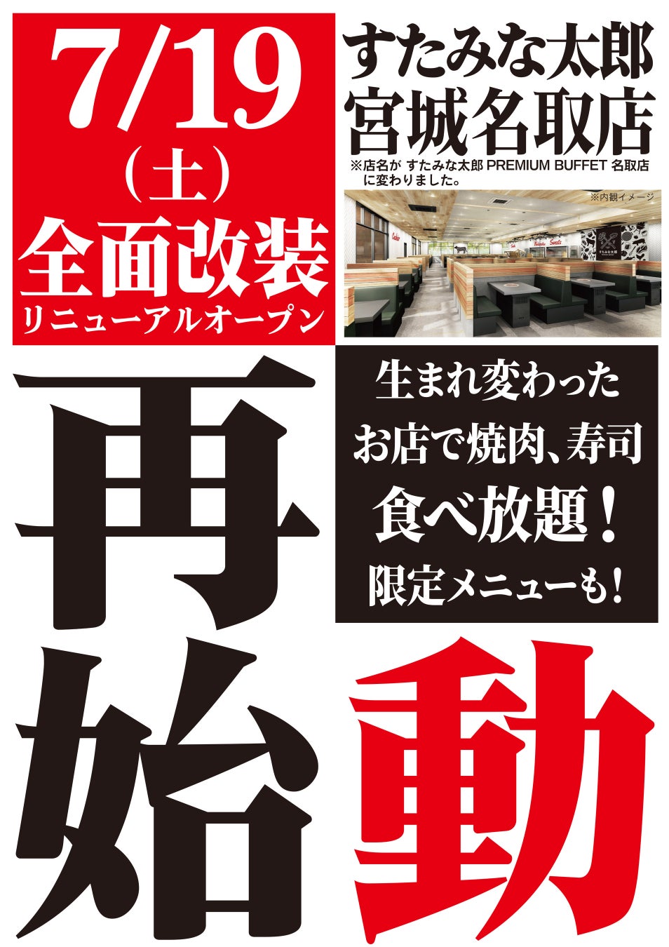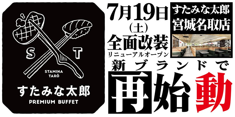 焼肉、寿司食べ放題の「すたみな太郎 宮城名取店」が7/19(土)全面改装オープン!「すたみな太郎 PREMIUM BUFFET 名取店」として再始動!自家製ピザ、期間限定うな丼パフェ他限定メニューも!