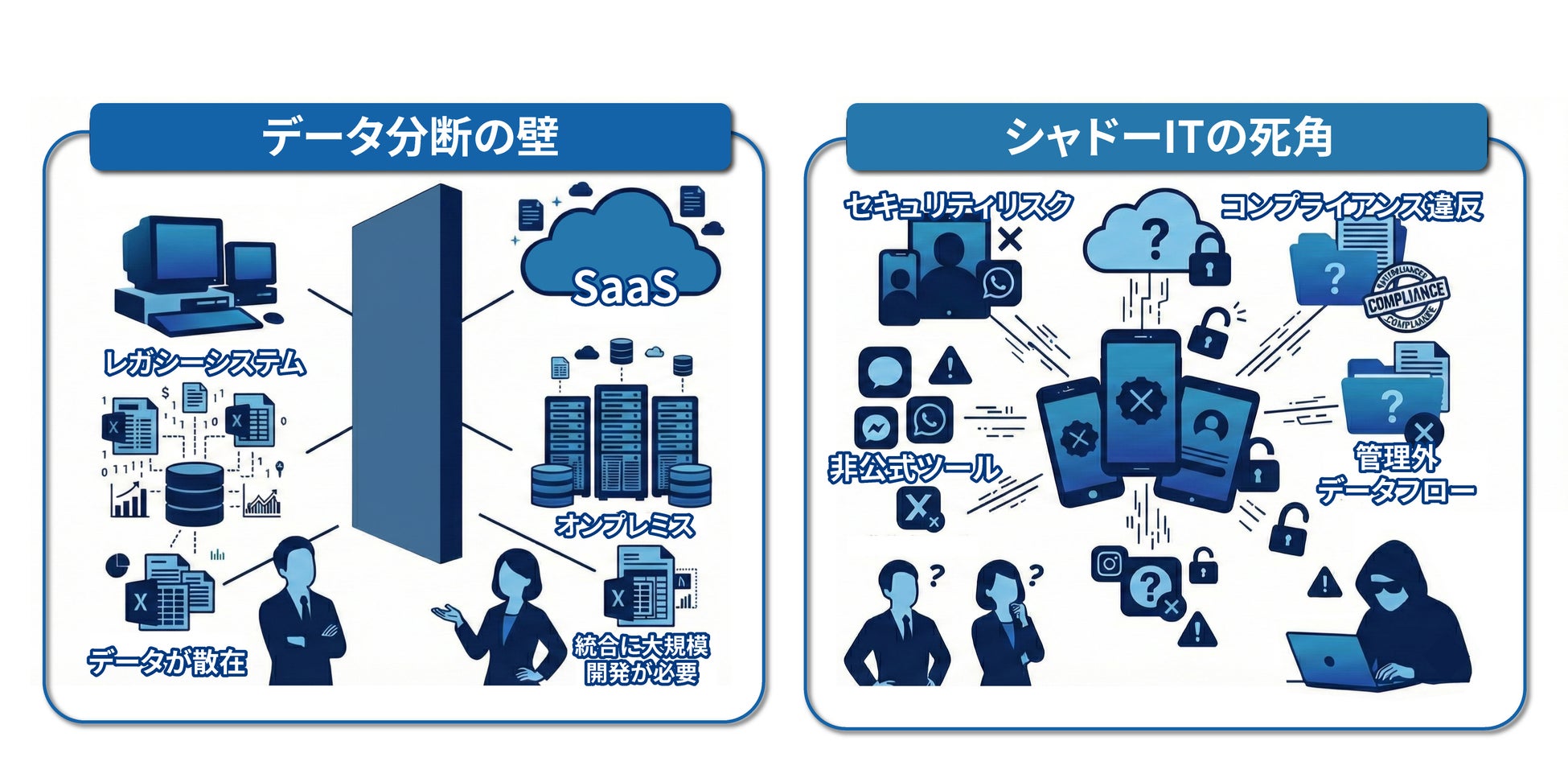 運用の壁(シャドーITとセキュリティ): 現場が独自のローコードツールなどでデータ連携を行った結果、誰がどの重要データにアクセスしているか把握できない「野良ツール」が乱立。情報漏洩リスクや、不適切な権限によるデータ事故の温床となっています。