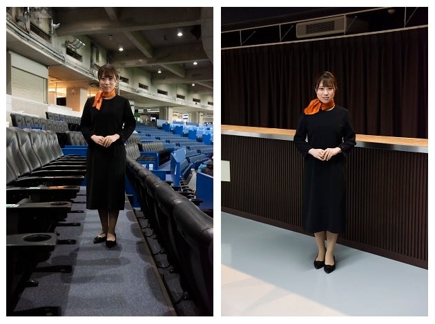 ハイクラスエリアで接客を行うアテンダントのユニフォームは、各アイテムともシンプルで洗練された雰囲気にまとめました。観客席間の移動や階段の上り下りが多いダイヤモンドボックスのアテンダント向けにはスカートの裾にプリーツを入れて動きやすさをサポートする一方、シーズンシート窓口での対応業務が中心となるカスタマーデスクスタッフ向けユニフォームには裾がタイトなワンピースを採用。着用シーンに合わせた機能性と制服としての美しさを両立させています。