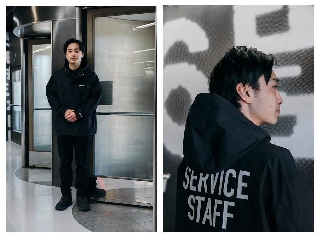 東京ドームの内装空間のコンセプトに合わせて、ベースカラーはブラックに。背中の「SERVICE STAFF」の文字に東京ドーム場内と同じタイプフェイスを使用することで、その場の臨場感を盛り立てます。ポロシャツは程良い動きやすさにトレンドを加味したルーズなシルエット、ブルゾンは襟元を立てたフーディスタイルにして、上質でスタイリッシュなスタイルを打ち出しています。素材には、再生ポリエステルを一部採用しました。
