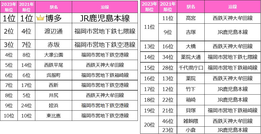 福岡の中心地がTOP3を独占!一人暮らし女性向け物件検索サイトWoman.CHINTAIユーザーが選んだ住みたい街ランキング2023(九州圏版)
