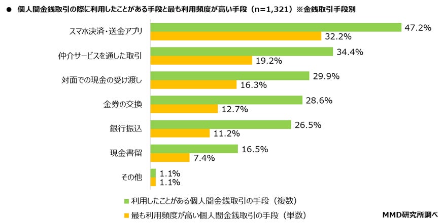 次に、推し活で個人間金銭取引をしたことがある1,321人を対象に、個人間金銭取引の際に利用したことがある手段(複数回答可)と最も利用頻度が高い手段をそれぞれきいたところ、個人間金銭取引の際に利用したことがある手段は「スマホ決済・送金アプリ」が47.2%と最も多く、次に「仲介サービスを通した取引」が34.4%、「対面での現金の受け渡し」が29.9%となった。最も利用頻度が高い手段は「スマホ決済・送金アプリ」が32.2%と最も多く、次に「仲介サービスを通した取引」が19.2%、「対面での現金の受け渡し」が16.3%となった。
