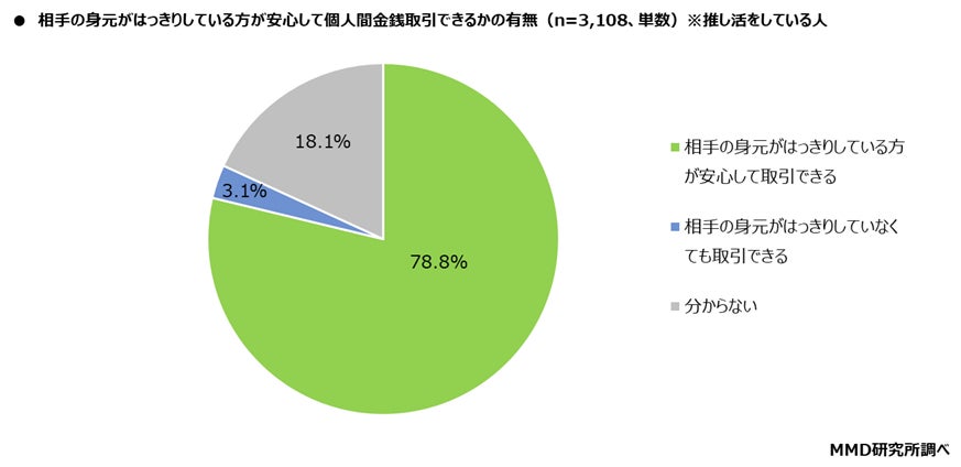 推し活をしている3,108人を対象に、相手の身元がはっきりしている方が安心して個人間金銭取引できるかをきいたところ、「相手の身元がはっきりしている方が安心して取引できる」が78.8%、「相手の身元がはっきりしていなくても取引できる」が3.1%となった。