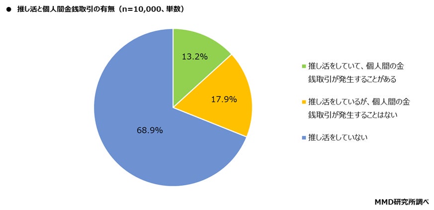 15歳~69歳の男女10,000人を対象に、推し活と個人間金銭取引についてきいたところ、「推し活をしていて、個人間の金銭取引が発生することがある」が13.2%、「推し活をしているが、個人間の金銭取引が発生することはない」が17.9%となり、あわせて31.1%が推し活をしていると回答した。