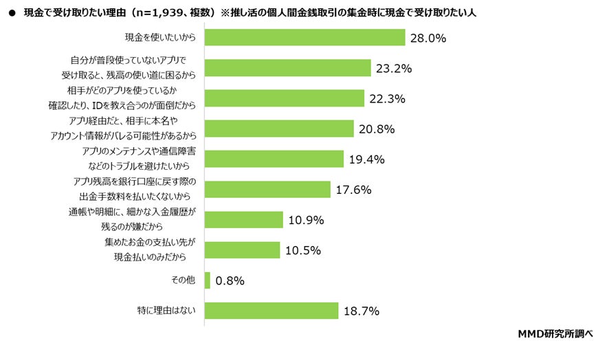 次に、推し活の個人間金銭取引の集金時に現金で受け取りたい1,939人を対象に、現金で受け取りたい理由をきいたところ(複数回答可)、「現金を使いたいから」が28.0%と最も多く、次に「自分が普段使っていないアプリで受け取ると、残高の使い道に困るから」が23.2%、「相手がどのアプリを使っているか確認したり、IDを教え合うのが面倒だから」が22.3%となった。
