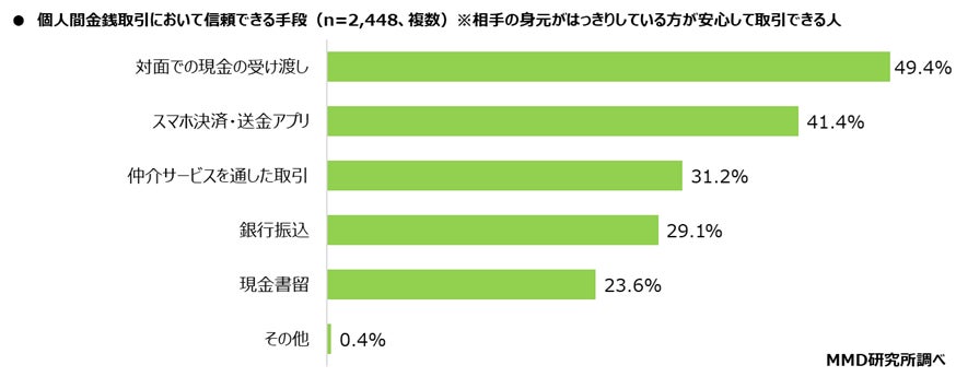 次に、相手の身元がはっきりしている方が安心して個人間金銭取引できる2,448人を対象に、個人間金銭取引において信頼できる手段をきいたところ(複数回答可)、「対面での現金の受け渡し」が49.4%と最も多く、次に「スマホ決済・送金アプリ」が41.4%、「仲介サービスを通した取引」が31.2%となった。