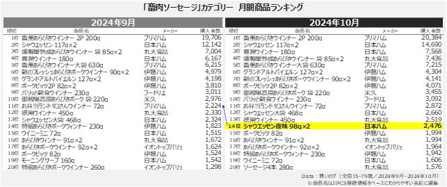 では、発売から1ヶ月間で「シャウエッセン®夜味」は果たして何位にランクインできたのでしょうか。発売前後の9月と10月で「畜肉ソーセージ」の月間売れ筋商品ランキングを調べたところ、10月に「シャウエッセン®夜味」は、並み居る既存品をおさえて「14位」にランクインしていました。なお、「シャウエッセン®夜味」の月間購入者数2,476人は前月9月の11位に相当する人数です。それだけ注目され、気になる存在だったのかもしれませんね。
