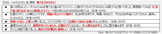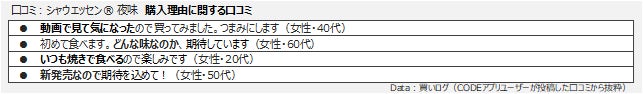 それでは、実際に商品を購入した人はどんな評価をしているのでしょうか。CODEで収集している「シャウエッセン®夜味」を買った人の口コミをいくつか紹介したいと思います。まずは購入理由に関する口コミです。