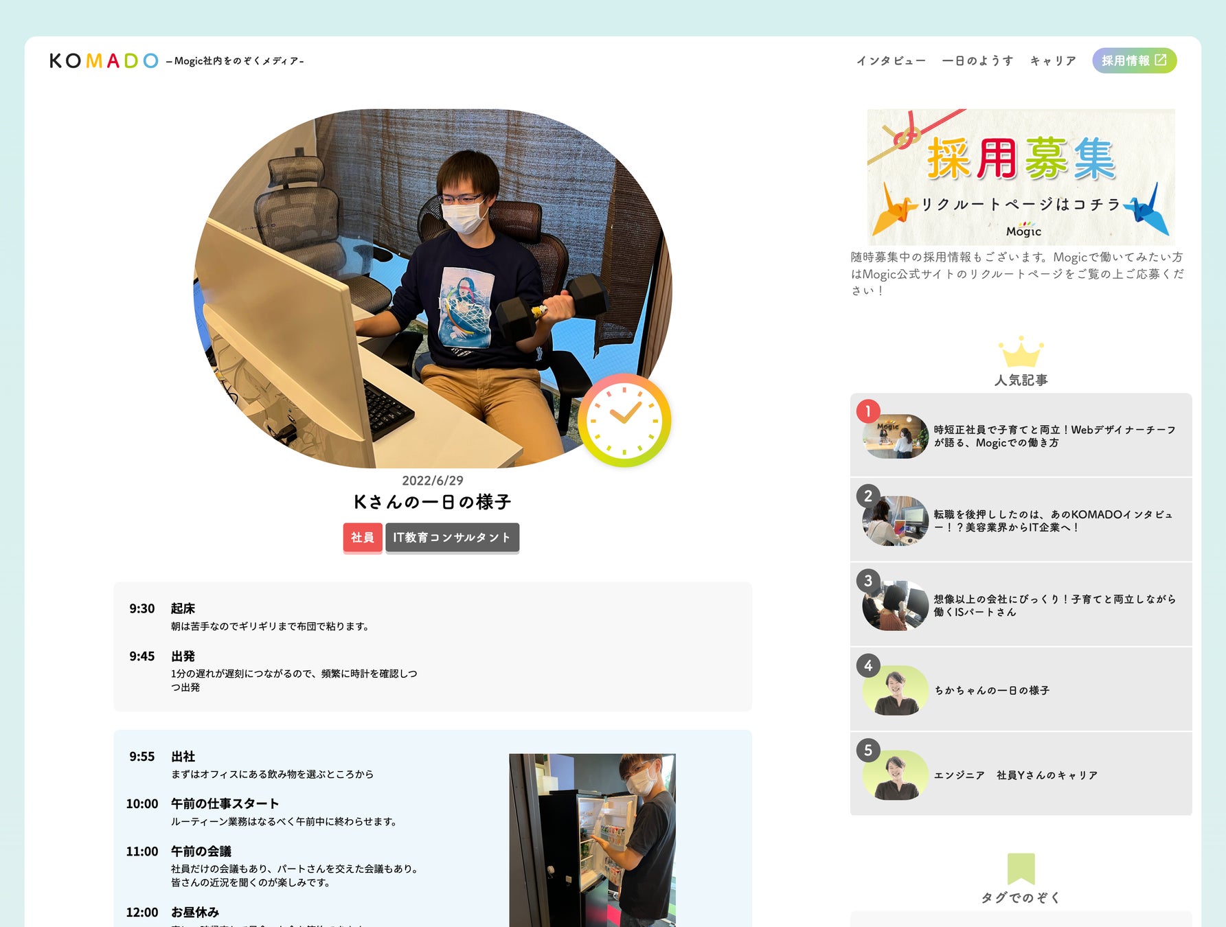練馬区石神井町のIT企業Mogicは、一般的な会社HPに掲載されている会社概要・事業内容などの形式的な情報だけでは伝えきれない、職場の空気感や働くスタッフの人柄含めた「ありのままのMogic」をユニークな形でお届けしたいとの思いから、2018年6月20日に弊社社内をのぞくメディア「KOMADO」を立ち上げました。開設当初より評判は上々で、特に就職希望の方からは「仕事内容を具体的にイメージしやすい」と大変好評です。実際に、同サイトを閲覧したうえで求人に応募し、今では私たちの仲間となっている者も数多くいます。