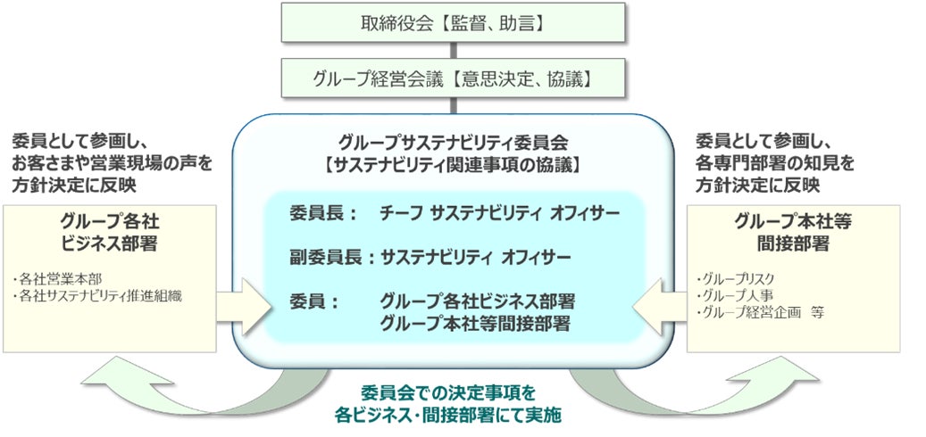 当行グループは、2021年1月にグループサステナビリティ委員会を設置し、サステナビリティ推進体制の構築に努めてまいりました。今般、「事業を通じたサステナビリティの実現」に向けた取り組みをさらに加速させるため、委員会の体制を大幅に見直し、グループ各社のビジネス部署およびサステナビリティ推進組織を中心とする構成といたしました。リスク、人事、経営企画を管轄する部署も参画し、環境や人権のリスク、ガバナンス、ダイバーシティなど、金融機関グループとして果たすべき責任についても引き続き推進いたします。