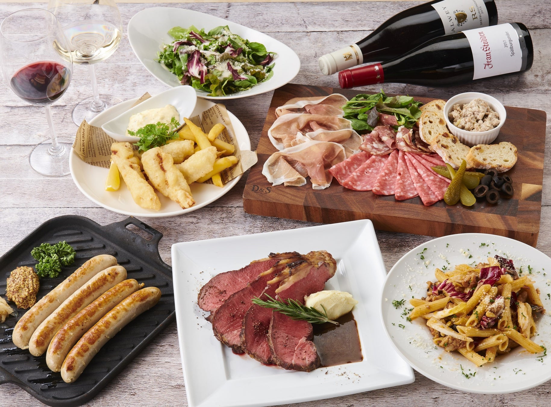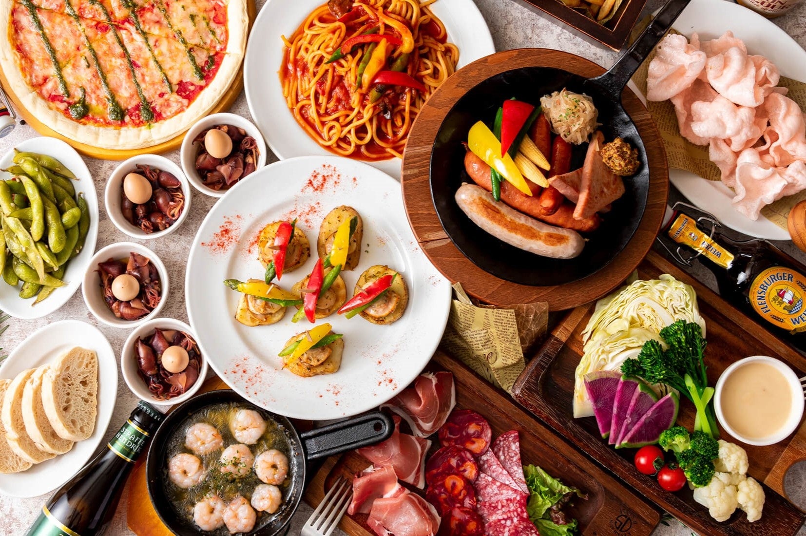 ヨーロッパのカジュアルな街並みをイメージさせる空間に、世界各国の料理をご用意。世界各国から取り寄せた貴重な樽生ビールやボトルビールも多数取り揃えています。