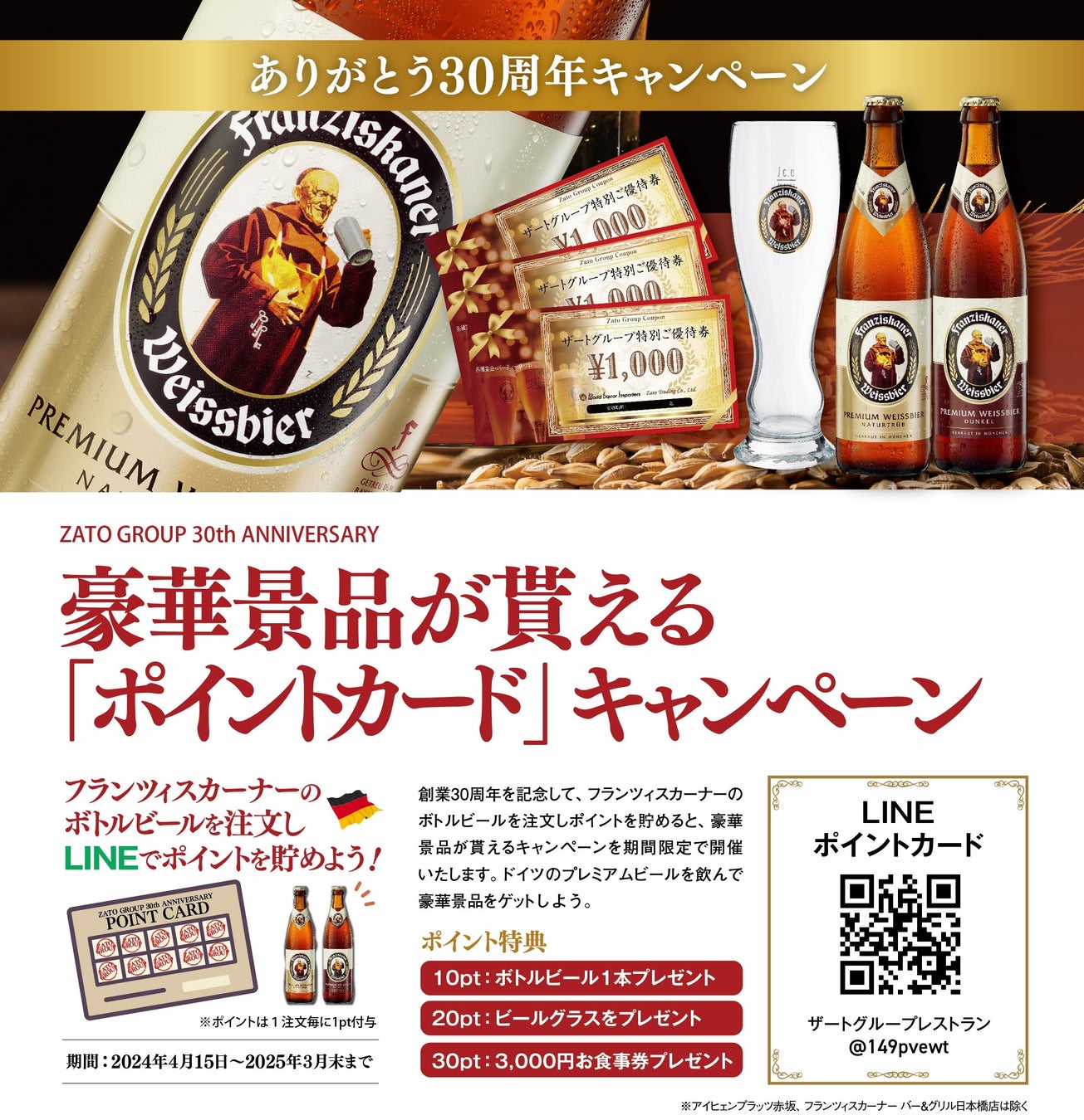 フランツィスカーナーのボトルビールを注文してLINEでポイントをためていただくキャンペーンです。1本につき1ポイントをゲットでき、10ポイントでボトルビール1本プレゼント。20ポイントでビールグラスをプレゼント。30ポイント集めると3,000円分のお食事券をプレゼントいたします!ぜひご来店いただき美味しいビールを味わい、ポイントをためてください!貴重なフランツィスカーナービールを味わえる店舗は希少です。