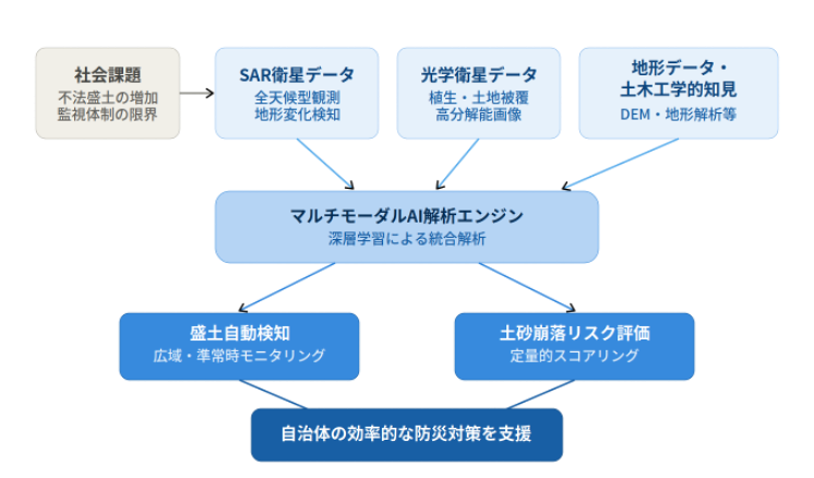 本事業では、複数の衛星データとAI技術を組み合わせ、広域にわたる盛土の自動検知と、検知された盛土の土砂崩落リスクを定量的に評価するシステムを開発します。自治体の調査ニーズに応じた複数の検知モードを備え、天候条件に左右されにくい安定的な監視体制の構築を目指します。
