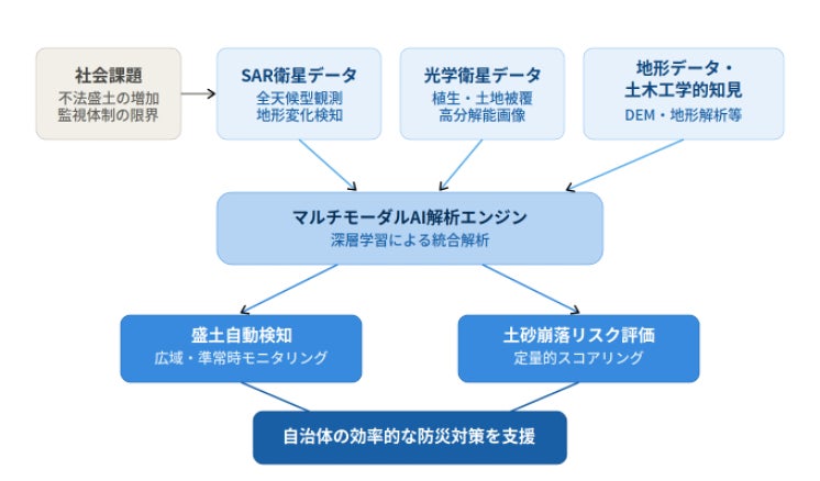 株式会社スペースシフト(本社:東京都千代田区、代表取締役:金本成生、以下「スペースシフト」)は、国立研究開発法人宇宙航空研究開発機構(以下「JAXA」)が公募した宇宙戦略基金(第二期)の技術開発テーマ「衛星データ利用システム実装加速化事業」において、株式会社ウエスコ(本社:岡山県岡山市、代表取締役社長:北村彰秀、以下「ウエスコ」)を代表機関として採択された技術開発課題「マルチモーダルAIによる違法・不正盛土検知と土砂崩落リスク評価」に、連携機関として参画することをお知らせします。