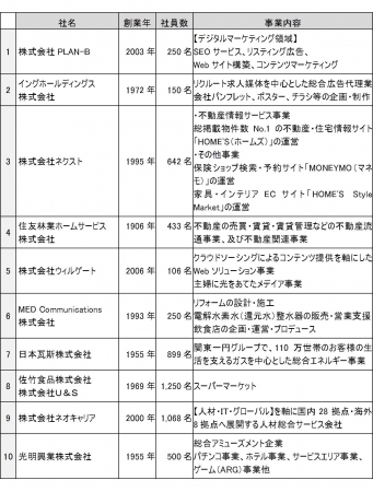1位は、(株)PLAN-Bが受賞。「日本を代表するインターネットカンパニーを創る」という企業理念を社員ひとりひとりが持つことで、高いモチベーションを生み出し、1位という結果につながりました。2位以降のランキングに関しては、下記をご参照ください。