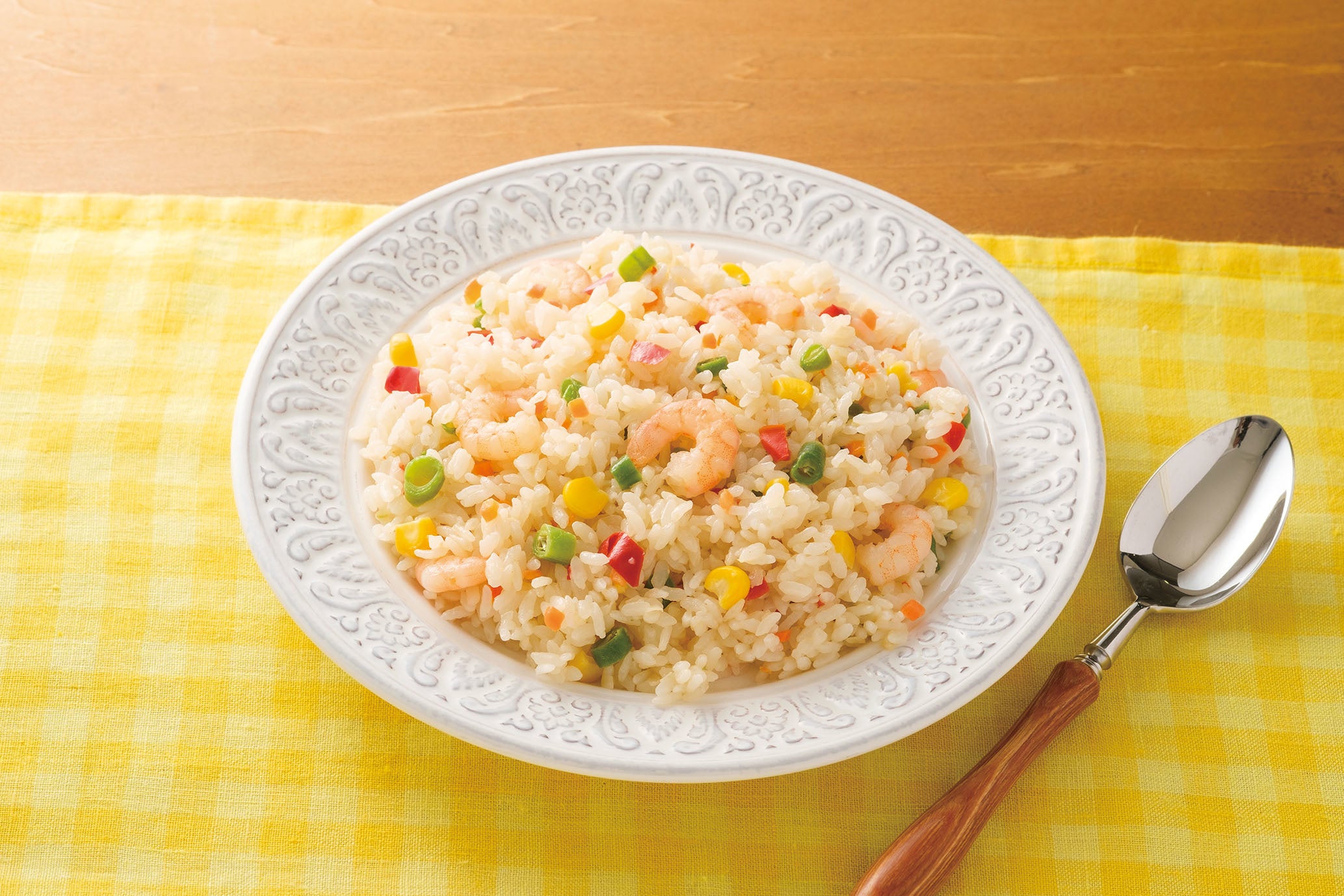 北海道産の「きらら397」は、調味料の吸収が良く丼物や炒飯に最適な品種です。「産直米のえびピラフ」は産直産地で栽培された同品種を限定で使用し、バターの香りを高める独自の「香りUP製法」で製造した一品です。具材のえびは殻付きでボイルして身の中にうまみを閉じ込めました。