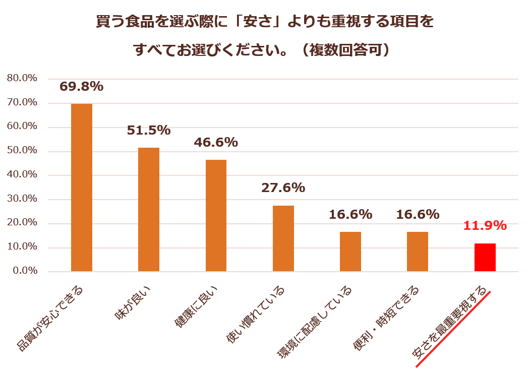 食品を選ぶ際に「安さ」よりも重視する項目について聞いたところ、「品質が安心できる」(69.8%)、「味が良い」(51.5%)、「健康に良い」(46.6%)の順で多く、「価格を最重要視」する人の割合は11.9%にとどまりました。また、「環境に配慮している」が「便利・時短できる」と同率の16.6%が重視すると回答しており、エシカル消費の動きも垣間見られる結果となりました。