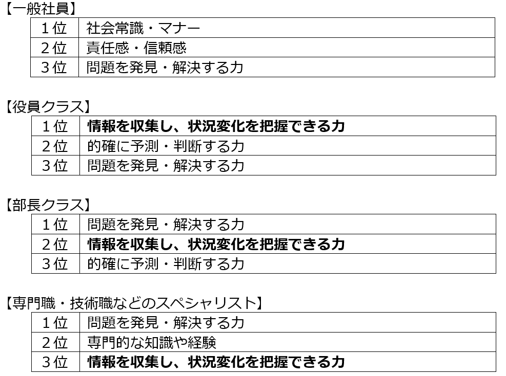 一般社員では、「社会常識・マナー」「責任感・信頼感」など、比較的易しいスキルが求められる一方で、役員クラス・部長クラスのエグゼクティブポジションでは、「情報を収集し、状況変化を把握できる力」「的確に予測・判断する力」「問題を発見・解決する力」など、より難易度の高いスキルが求められ、スペシャリストは専門職ならではの「専門的な知識や経験」を他のポジションよりも求められています。