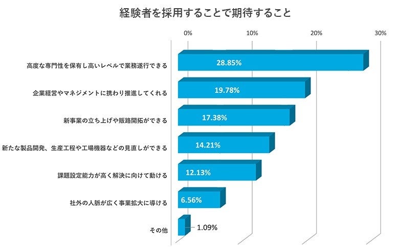 また、企業からは経験者を採用することによって「高度な専門性を保有し高いレベルで業務遂行できる」「企画経営やマネジメントに携わり推進してくれる」といった効果が期待されています。